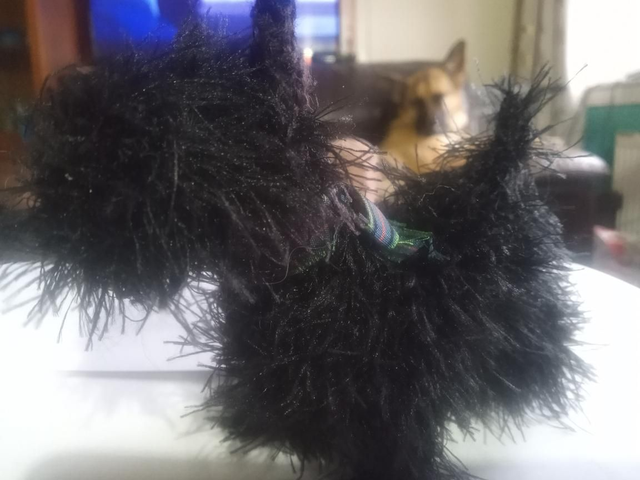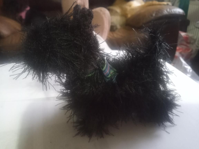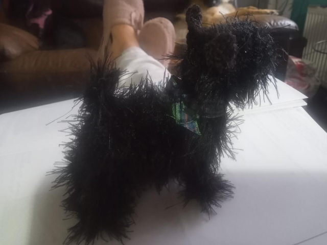 small hand knitted Scotty dog. I make these to order with polyester eyelash yarn and beads for eyes and they also have a tartan ribbon and bow round the neck.