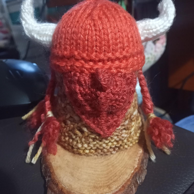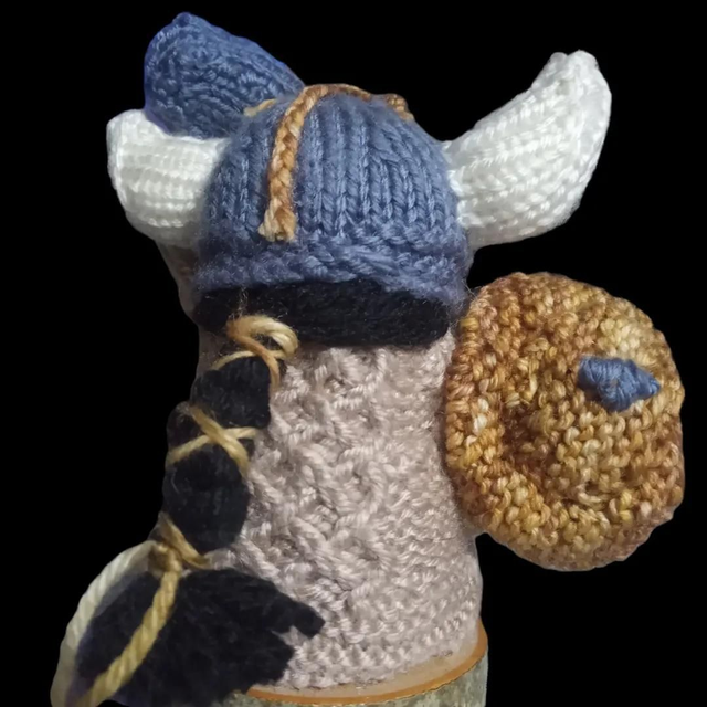 the Viking is made from acrylic and wool yarn with wire for supporting the arm and hammer and fire retardant stuffing.