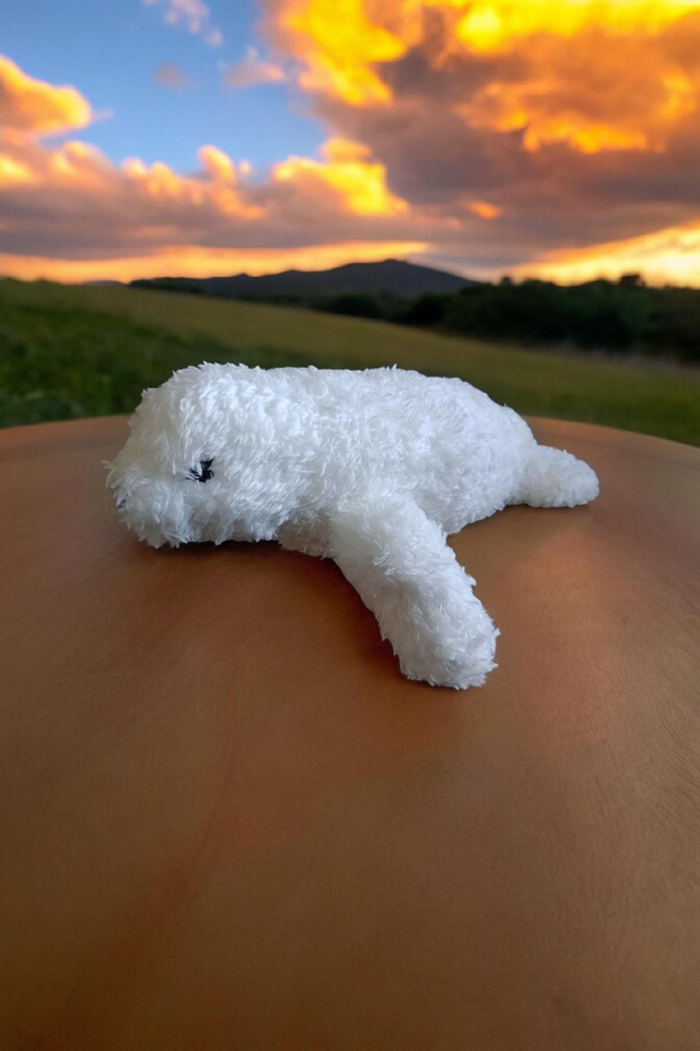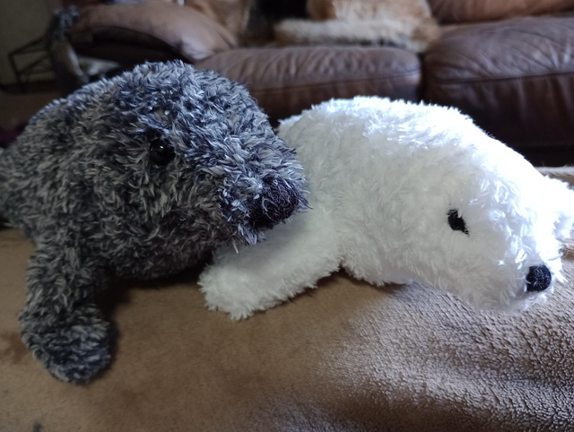 The larger adult grey seal is about 6-7 inches long, the smaller cream infant is about 4-5 inches long. Sooooo cute 🥰